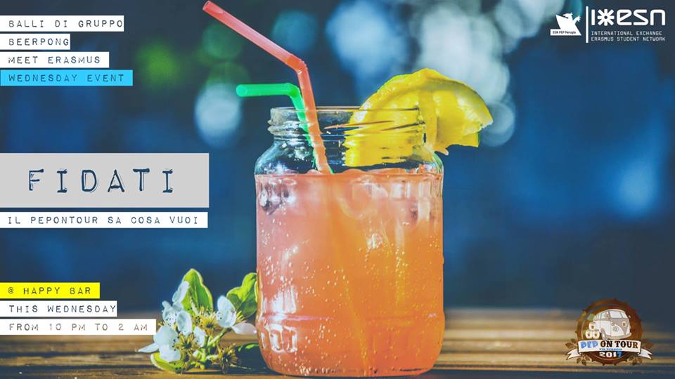 Ogni mercoledì ESN Perugia vi porta in un bar diverso, dove potrete bere birre a 1€ e cocktail a prezzi bassissimi. E' un modo originale per vivere il mercoledì notte perugino e conoscere nuovi Erasmus in città.
