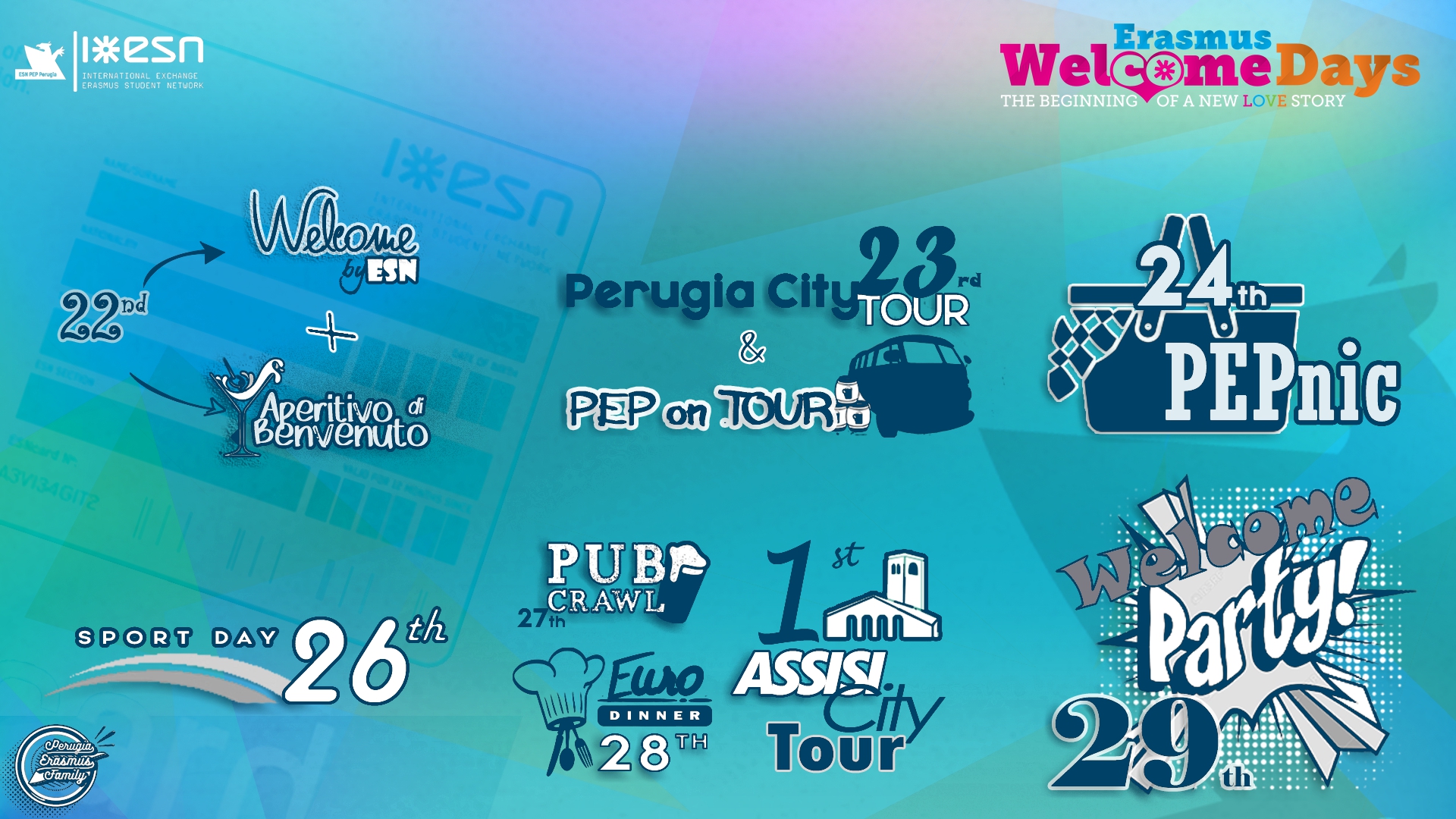 Ciao Erasmus! ESN Perugia è lieta di darvi il benvenuto a Perugia per quella che sarà una delle esperienze più belle della vostra vita. Abbiamo organizzato per voi una settimana ricca di eventi, tra viaggi, attività culturali e ovviamente feste.