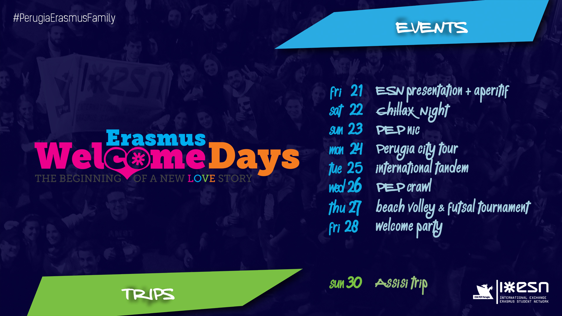Friday 21st, h 5:00 PM, @Aula 3, Dipartimento di Economia e Scienze Politiche: presentation to get to know ESN Perugia, our events and our trips! Sneak peak on the National Event in Rome and ESNcard enrollment.